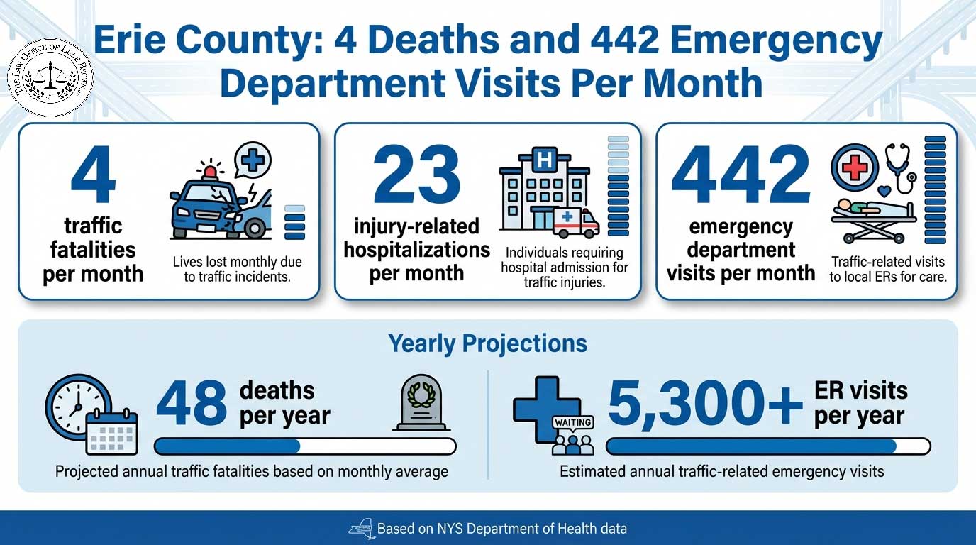 Based on NYS Department of Health data, Erie County averages approximately 4 traffic fatalities, 23 injury-related hospitalizations, and 442 emergency department visits per month from motor vehicle crashes.