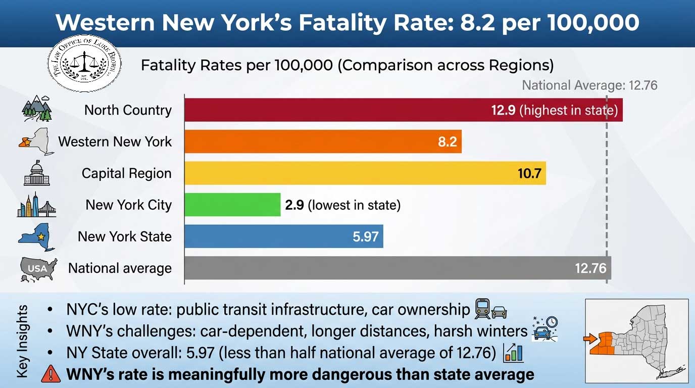For context, New York State as a whole remains one of the safer states nationally, with a fatality rate of 5.97 per 100,000 — less than half the national average of 12.76. But that statewide number is pulled down significantly by New York City. The picture in WNY is meaningfully more dangerous.