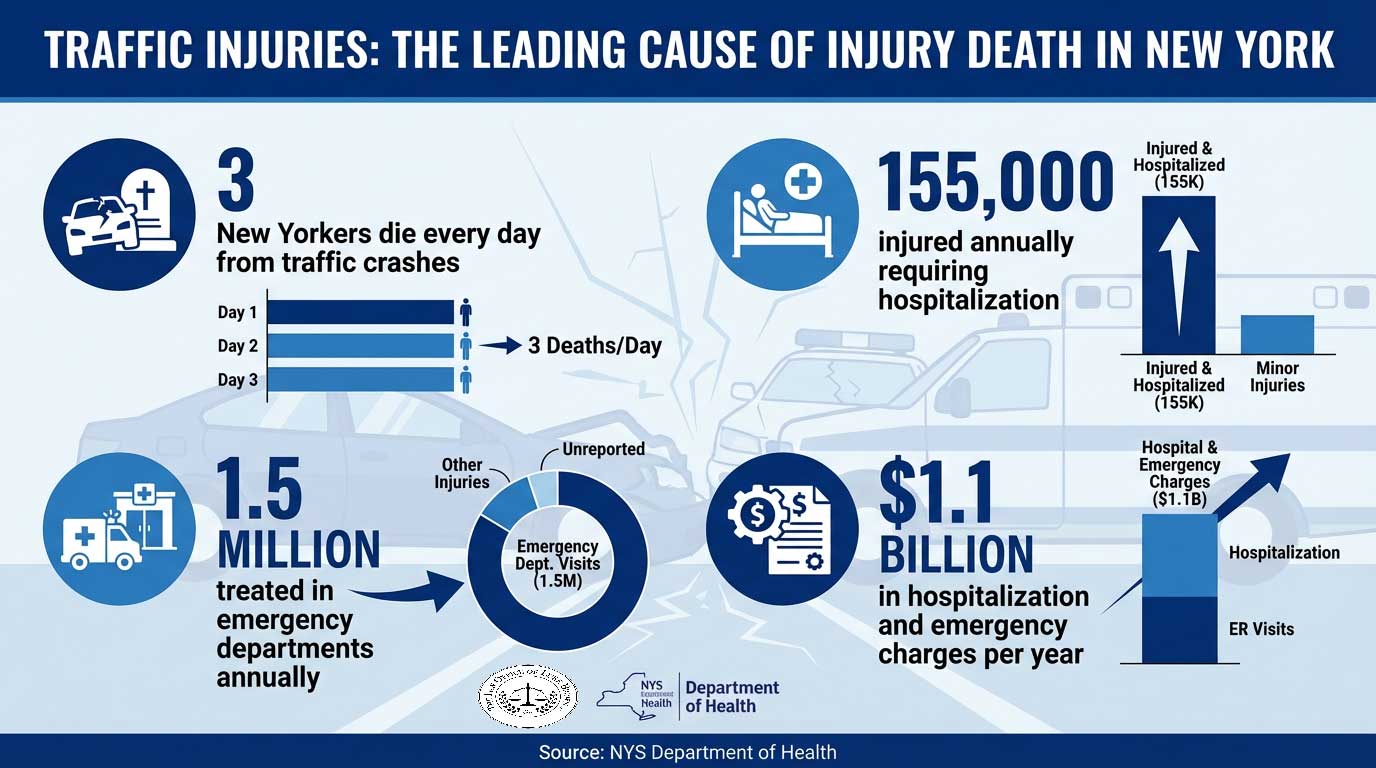 According to the NYS Department of Health, traffic-related injuries are the leading cause of injury-related death for New Yorkers. On average, three New Yorkers die every day from a traffic crash. Over 155,000 individuals are injured severely enough to require hospitalization annually, and another 1.5 million are treated in emergency departments.